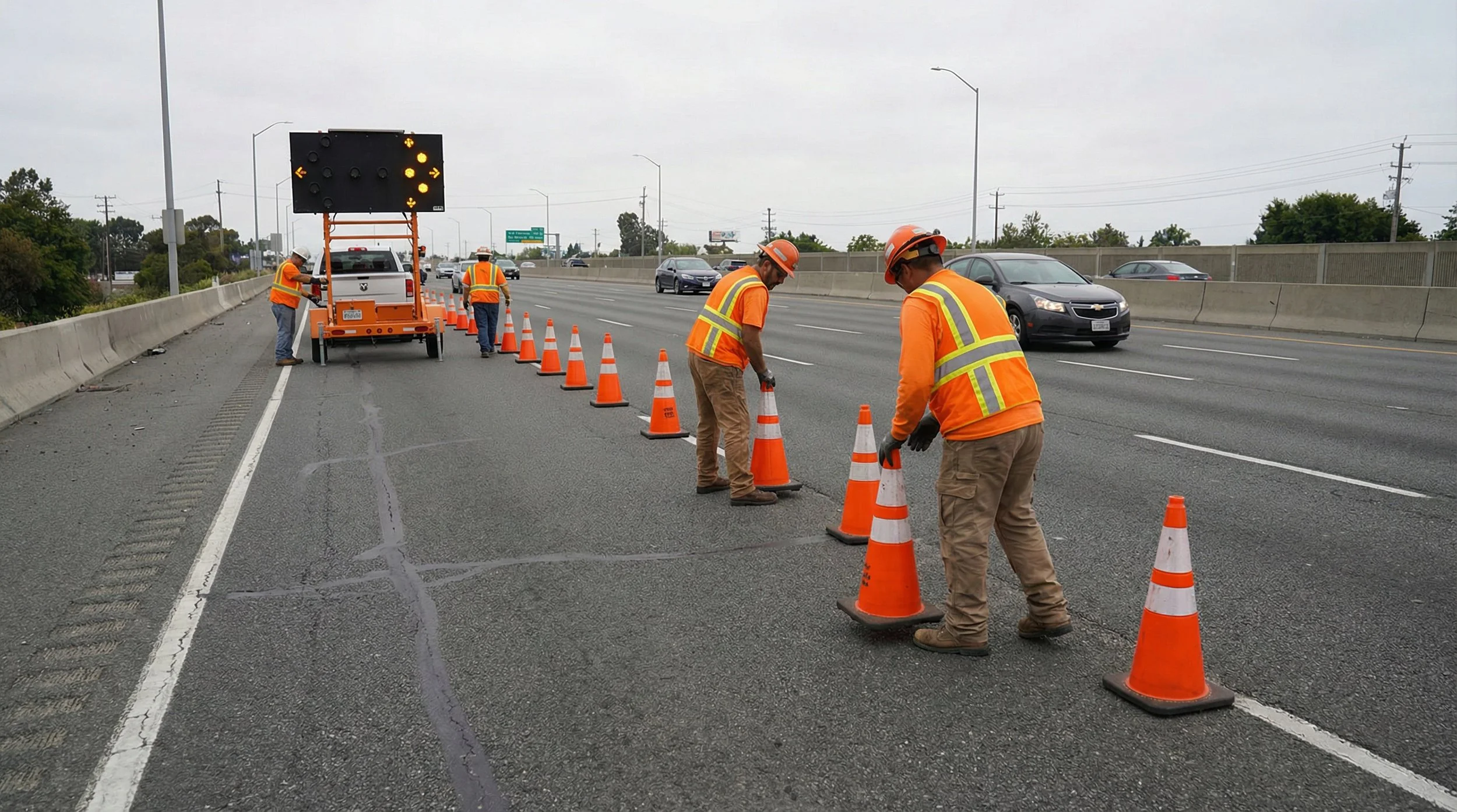 Cones, delineators, and signage setup (as required)